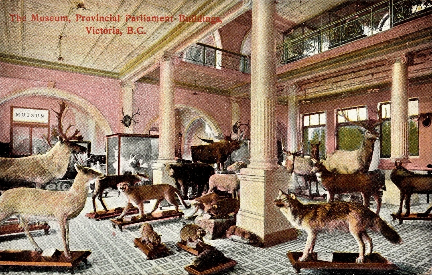 Big game species such as the Roosevelt elk were a major part of the earliest natural history collections of the British Columbia Provincial Museum which was founded in 1886. The first curator, John Fannin, was a taxidermist and a hunter naturalist who donated many of his own specimens to the museum. The museum’s mandate was to secure and preserve ­specimens illustrating the provincial natural history and to collect anthropological material relating to the Indigenous peoples of the province. A postcard shows off its exceptional big game collection and conventional mounts but Fannin had toured some international museums and learned about the new group method. After his visit to the Provincial Museum in 1898, the director of the American Museum of Natural History noted that special attention had been given to “groups of birds and mammals presented in their natural environments.”