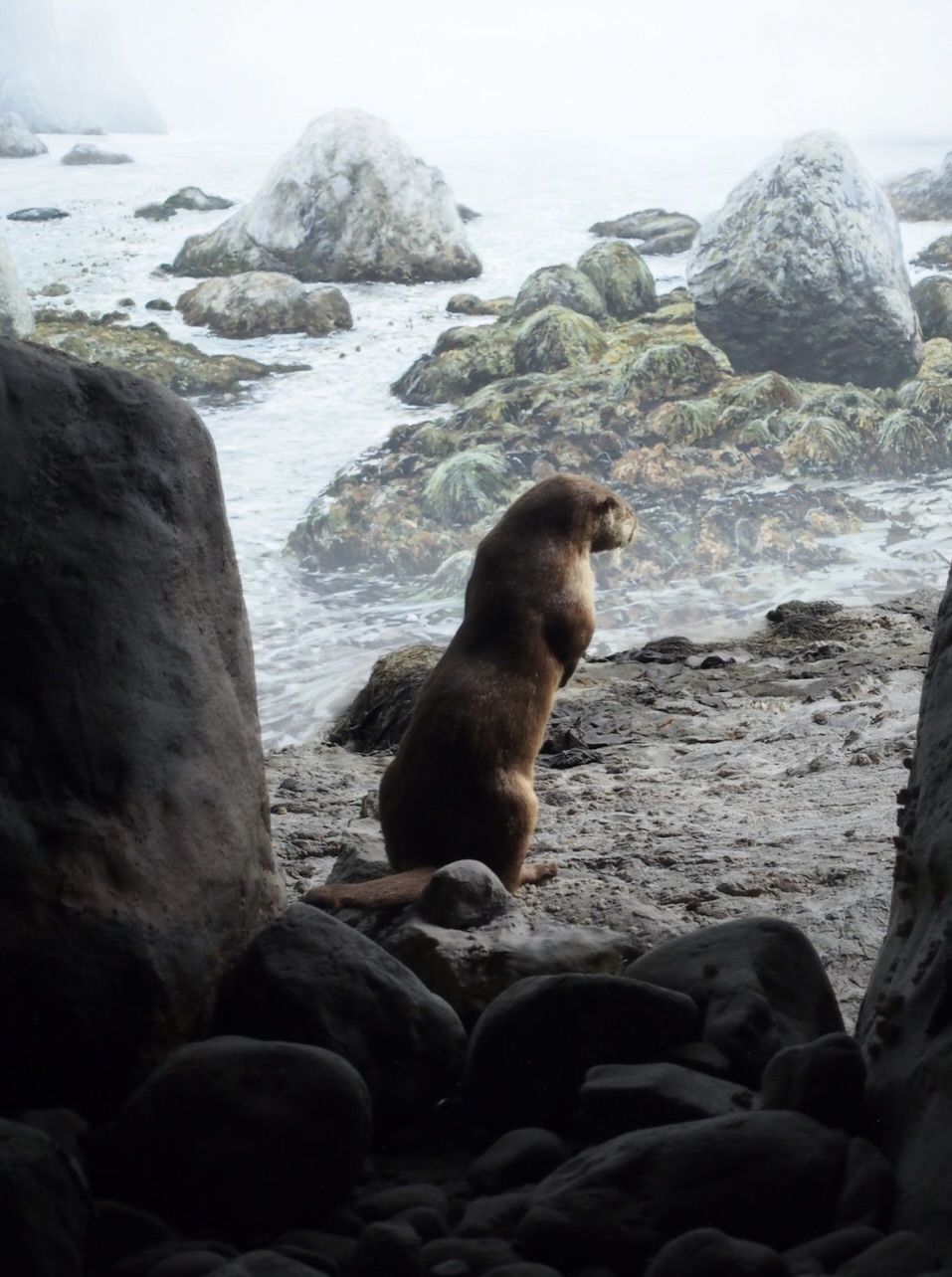 The natural history galleries at the Royal British Columbia Museum were designed to be “living landscapes” with lifelike taxidermy, real elements such as tide pools with live creatures, and audio visual technology. This innovative concept for creating an immersive experience of BC’s ecosystems was initiated by the talented French exhibition designer Jean Jacques Andre during the 1970s when a new building was being planned for the museum. Museum visitors can peer through a cave in the Living Ocean Diorama to catch a glimpse of a Sea Otter (Enhydra lutris) foraging for sea urchins. The rocks and foreshore were prepared by the exhibits staff and the background landscape was painted by Jan Vriesen.
